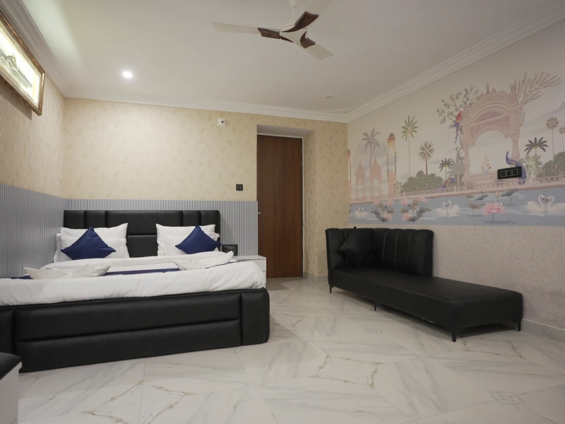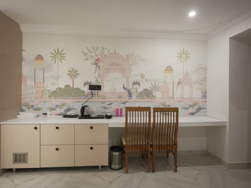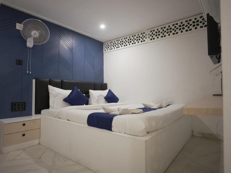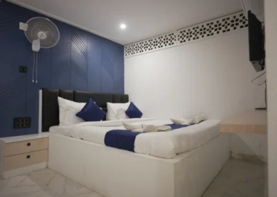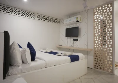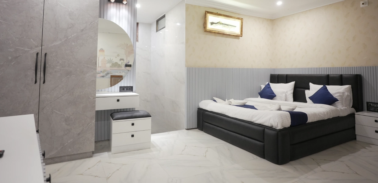 Each Deluxe Room features a well-planned layout with cozy interiors and modern essentials. Guests can enjoy common swimming pool access, perfect for a refreshing dip, and a kitchen facility, providing flexibility for home-style meals during your stay.